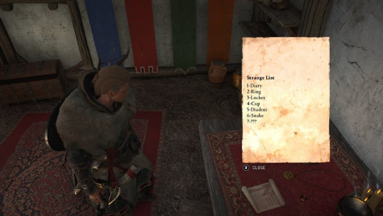 Only_A_Friend 在遊戲的倫敦地區內的一間房間中發現了一張「奇怪的名單(strange list),在進行查看時可能對部分玩家而言就是一組毫無意義的單詞。分別是日記、戒指、吊墜、杯子、冠飾、蛇。