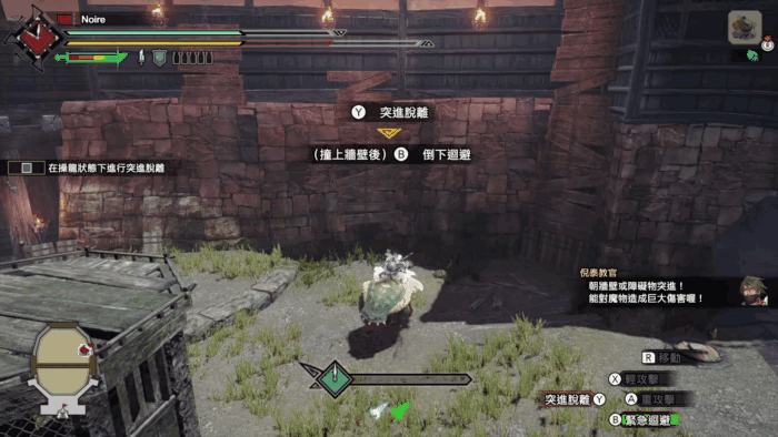 在怪物身上按Y鍵可以發動突進脫離,和《怪物獵人:世界》中的撞牆類似,不過在本作中你可以通過在撞牆後按B鍵來迴避掉掉落,再次進行撞牆(雙倍的快樂)。