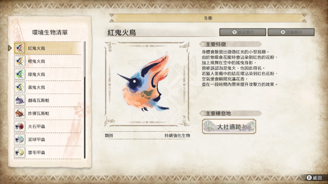 在本作中移除了《怪物獵人:世界》中的衣裝系統,取而代之的加入了大量有不同功能的環境生物來輔助我們狩獵。在地圖中我們可以找到大量的環境生物,這些環境生物大致可以分為提供強化類與可攜帶兩類。