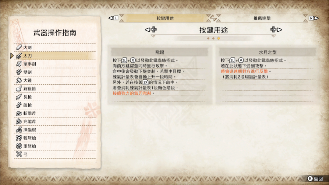 在拔出武器的情況下,玩家可以通過消耗翔蟲量表來使用鐵蟲絲技。這裡我推薦各位玩家先通過獵人筆記-武器操作指南來熟悉下自己武器鐵蟲絲技的具體描述,以免無法很好的發揮鐵蟲絲技的作用。
