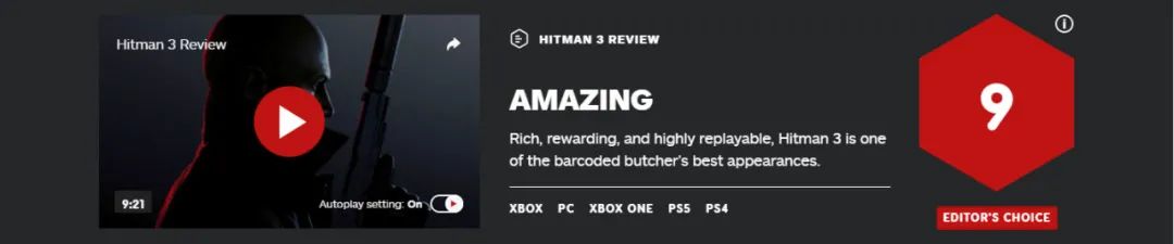 IGN 9分:內容豐富、重玩價值高,是系列中的翹楚,傑出的地圖設計使得當下的《殺手》三部曲,顯得更為優質和可靠。6張地圖聽起來少,但每一張面積大,本身也是為多次重玩設計的,但《殺手3》絕對是他最棒的演出之一。