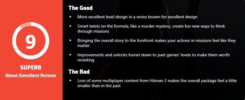 Game Spot 9分:《殺手》系列的優點(關卡設計以及創造性、實驗和探索)在《殺手3》中也很出色。這款游戲巧妙地呈現了之前的所有內容,利用並顛覆了玩家的預期,並給那些願意掌握游戲各個關卡和整個系列復雜性的玩家足夠的獎勵。