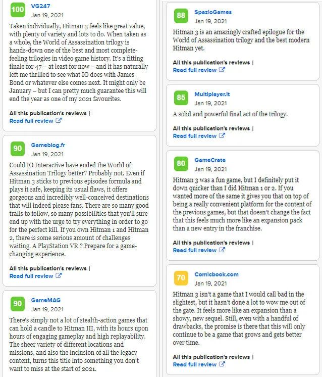 GameMAG:90分。其引人入勝的游戲性和可玩性根本沒有多少潛行動作游戲能夠與《殺手3》相提並論,不同的地點和任務的多樣性,以及前作內容的引入,使得《殺手3》成為2021開年就不容錯過的游戲。