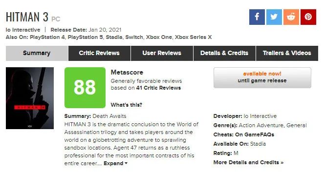 M站媒體均分 88分:目前為止最好的三部曲游戲之一,同時也是最好的《殺手》游戲。