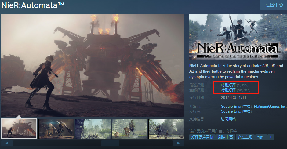 《尼爾:機械紀元》講述了機器人 2B、9S 和 A2 的故事,以及他們為奪回遭強大機械生命體占領、由機器驅動的反烏托邦而進行的戰鬥。目前該作在Steam的玩家評價為「特別好評」。