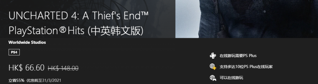 神秘海域4盜賊末路 4.5折 HK$66.60