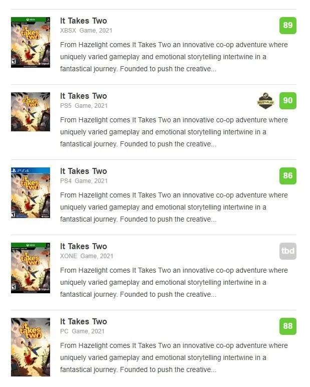 由《逃出生天》和《兄弟:雙子傳說》的得獎開發者Hazelight開發的合作類新作《雙人成行》媒體評分日前已經解禁,其中在metacritic上,PS5版評價均分高達90,被列為必玩推薦。其他平台版本也都超過85分。
