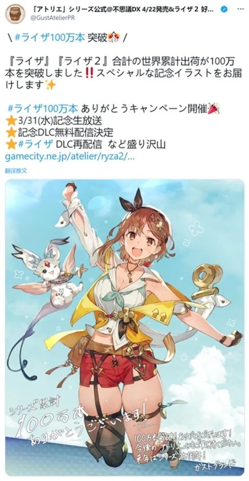 在3月30日,光榮特庫摩宣布《萊莎的煉金工房》系列兩部作品的全球累計出貨量超過100萬套。