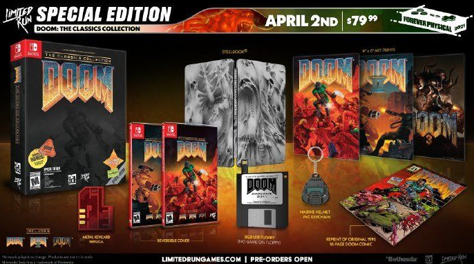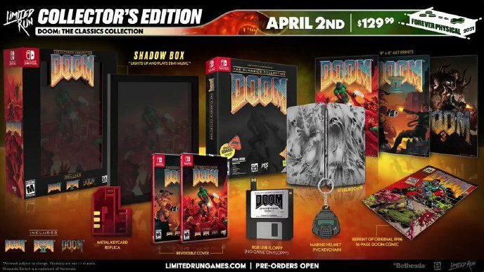 Limited Run Games官方宣布,《毀滅戰士》1至3部合集將推出NS實體版,於4月2日開啟預購。NS實體版分為普通版、特別版以及收藏版,售價分別為39.99美元、79.99美元和129.99美元。