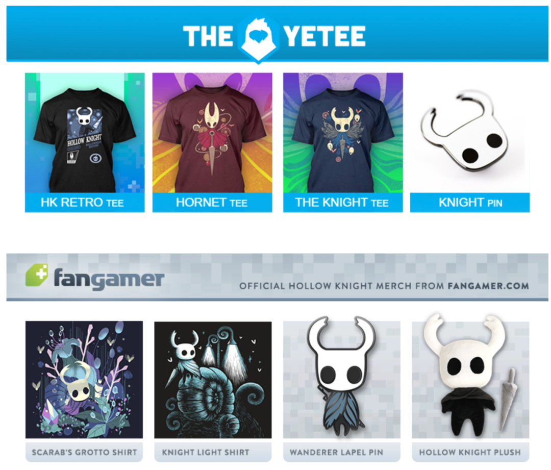 Team Cherry還是一家很近人情的公司。在他們官網上,明確表示玩家們可以通過製作《空洞騎士》的視頻來獲得受益。也允許玩家們製作各種《空洞騎士》的同人產品,並用於小規模的販賣(但企業想要賣周邊還是需要授權的)。