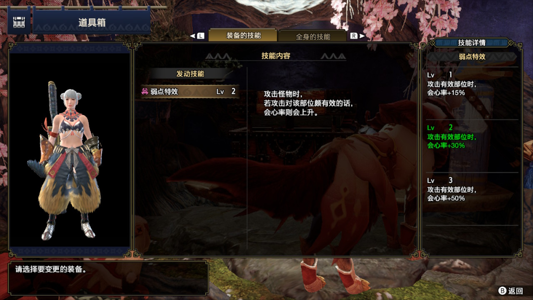 再來講講弱點特效這個技能,由於該技能的效果是LV3時對於弱點的會心率提高50%,所以成為了眾多追求輸出的玩家的重要技能。一個弱點特效LV2再加上一個二級插槽的護石(以下簡稱弱特2S2)成為了當前玩家們追求的對象。