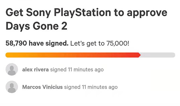 近日, 眾多遊戲玩家聯名請願索尼製作《往日不再2》。當部分玩家看到索尼拒絕了《往日不再2》的製作後,一位名叫Kanhai Raval的玩家決定在Change.org上發起了聯名請願活動,這項活動立刻受到了其他玩家的追捧。