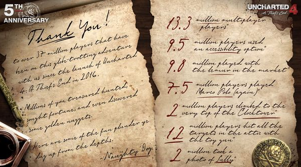 《神秘海域4》發售五周年的紀念日,頑皮狗在推特上發布了祝賀消息,並向玩家們表達了感謝,「為《神秘海域4:盜賊末路》發售五周年祝賀,我們想向所有加入我們和德雷克狂野之旅的玩家表示感謝。記得和狐猴一起玩!」