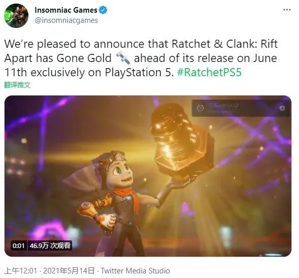 《漫威蜘蛛俠》開發商Insomniac為PS5平台打造的首款獨佔遊戲《瑞奇與叮噹:分離》即將發售,今天(5月14日)該公司通過社交媒體發布消息,宣布該遊戲已經進廠壓盤。