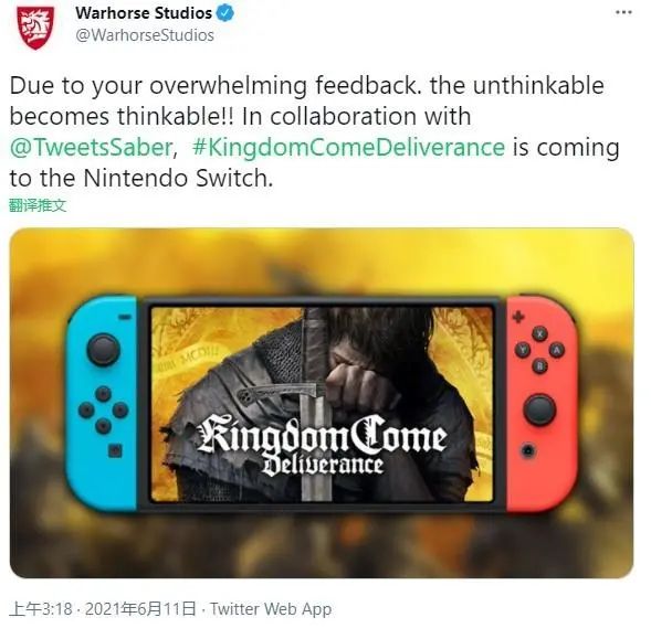 今年1月,任天堂日本官方網站的游戲發售日列表中曾出現過Switch《天國:拯救》的名字,並標記為2月18日上市,後來該消息被開發商Warhorse Studios負責宣發的人員否定。而今天,Warhorse Studios官方推特發布消息,正式確定Switch版《天國:拯救》存在,並由Switch版《巫師3》的開發商Saber負責移植,只是目前還沒有準確的發售日期。