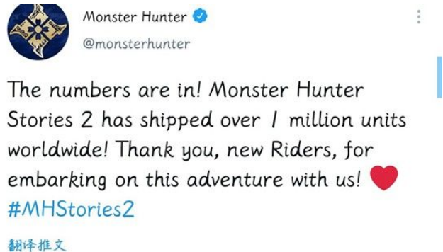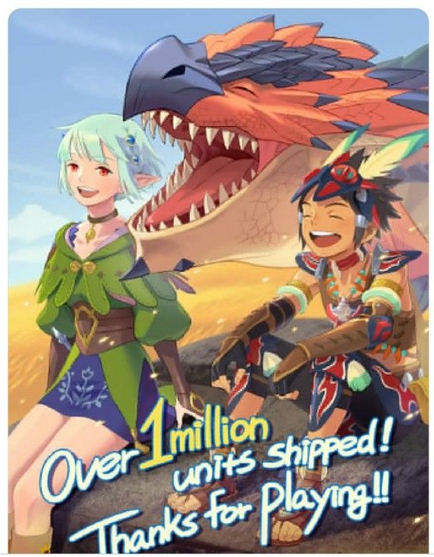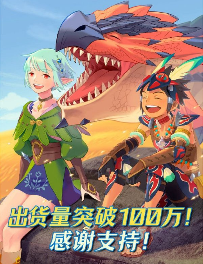 今日(7月20日),《怪物獵人物語2:破滅之翼》官方宣布該作累計銷量正式突破100萬份,並公布了官方賀圖。官方在公告中說道:「感謝與我們一同踏上冒險!」