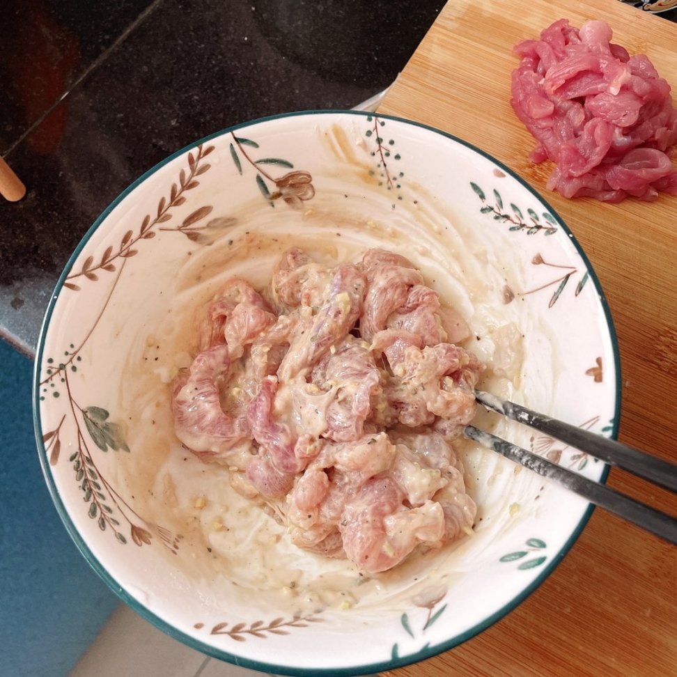 切片的豬肉加入紅薯澱粉、胡椒粉、花椒面、薑末、食鹽、蚝油、花雕酒、雞精,先攪拌均勻