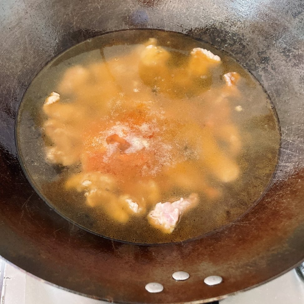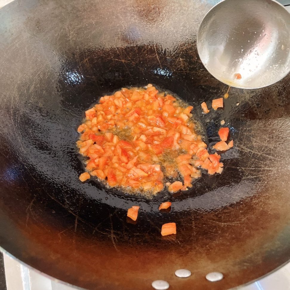 倒入番茄末和足夠底湯的食鹽翻炒出沙