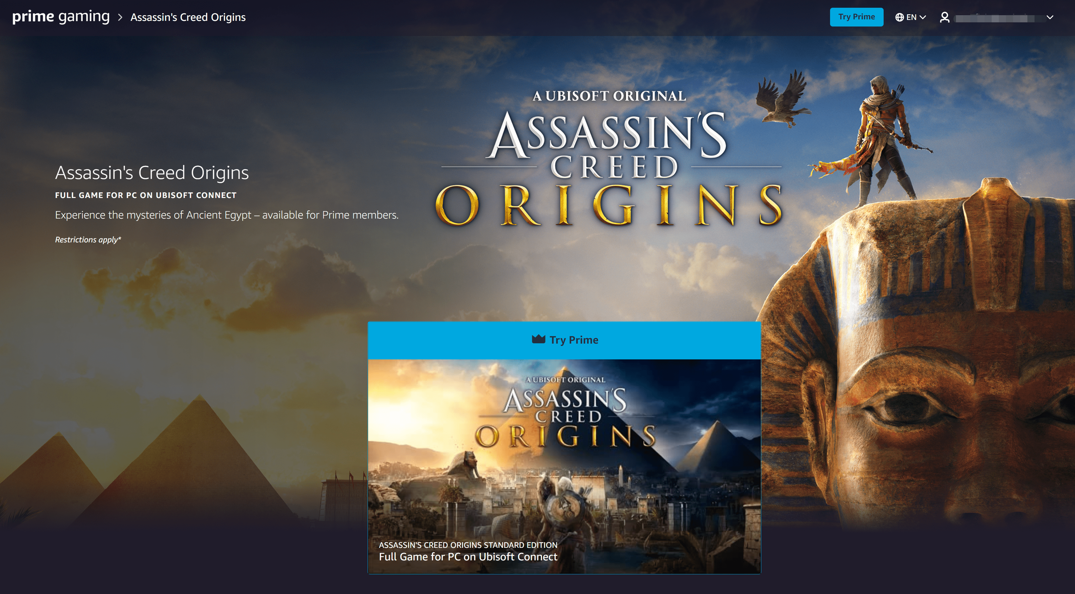 Amazon Prime Gaming本月可以免費領取【刺客信條 起源】Ubisoft Connect,可以使用30天的Prime免費試用期領取,之後記得取消訂閱避免收費。(美區)