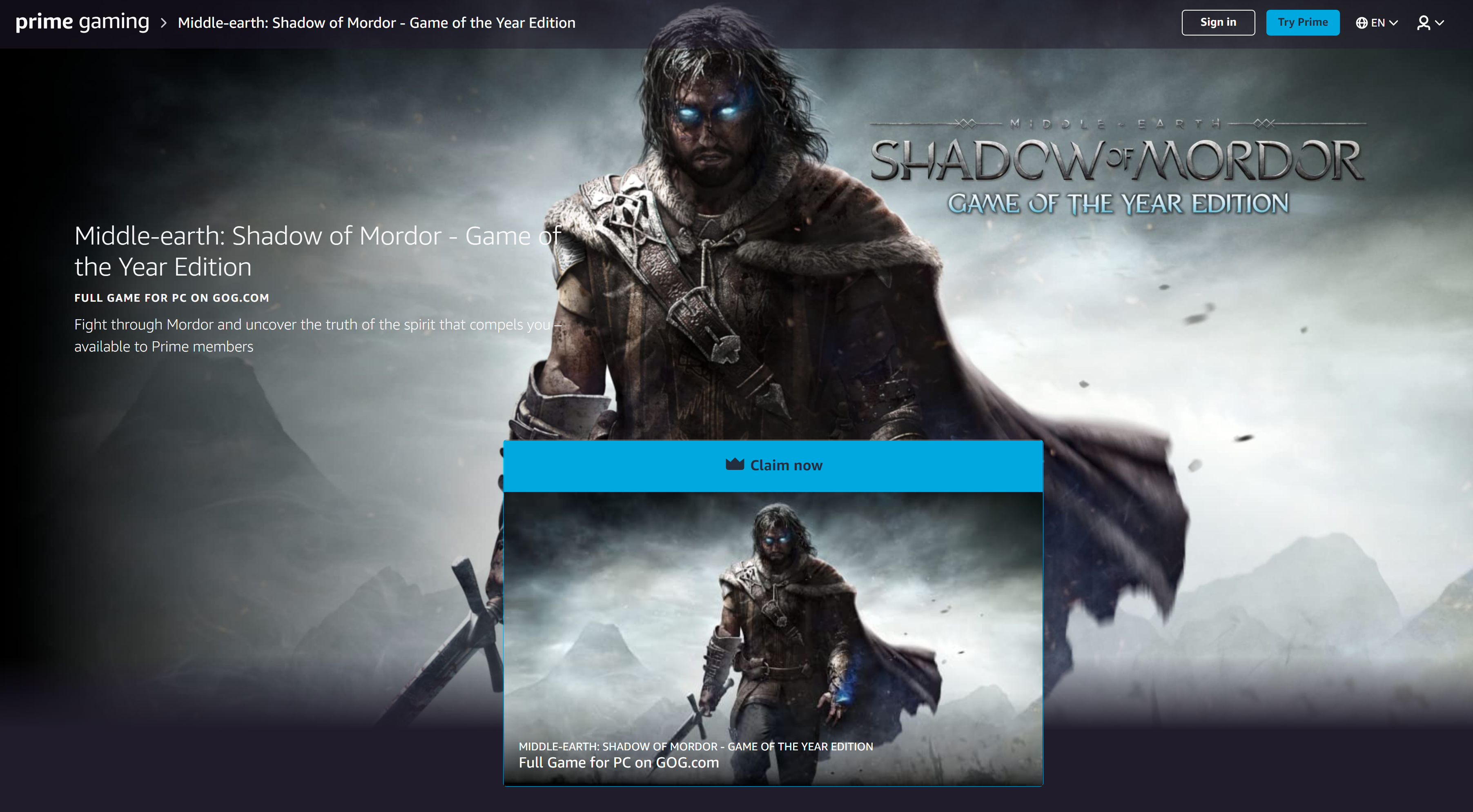 Amazon Prime Gaming本月可以免費領取【中土世界:暗影魔多】GOG激活碼,可以使用30天的Prime免費試用期領取,之後記得取消訂閱避免收費。(美區)