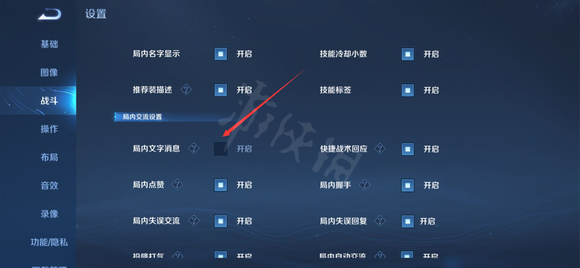 2、然後在設置的戰鬥中將局內文字消息關閉。就可以屏蔽局內聊天了。