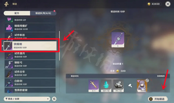 4、在配方列表,選擇鐵蜂刺,點擊開始鍛造,就可以獲得鐵蜂刺。