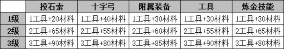 總共有5件裝備需要升級:投石索、十字弓、附屬裝備、工具和煉金技能。完全升級其中一件需要消耗6個工具和175邊角材料,每件裝備完全升級的所需材料數量完全相同。玩家可以在工作台上升級裝備,或者在解鎖了二級工具裝備後,在“升級菜單”中升級裝備。