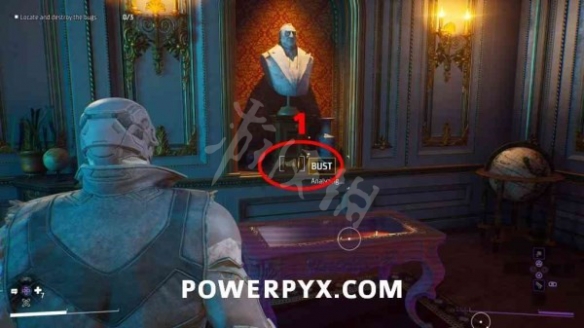 按【十字鍵-下】使用AR掃描三處竊聽器,第一個在門右側半身像的下方,分析並與之互動即可破壞。