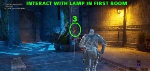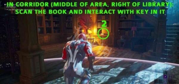 第二條電線通往該區域中間的走廊。走廊位於圖書館右側,從圖書館的角落上樓梯,然後沿著下一段樓梯走即可到達走廊。在樓梯底部轉身,可以看到地板下電線的白色輪廓,與電線指向的書互動並掃描,然後按下按鈕。