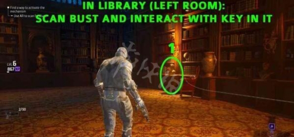 左側電線通往左側的圖書館,清怪然後按十字鍵的下掃描半身像,與半身像互動並按下隱藏按鈕。
