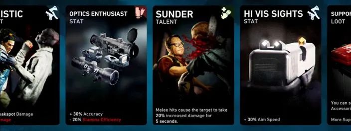 玩家可以從屬性各不相同的增益卡牌中自選15張作為一套卡組開始遊戲,配合不同角色的角色特性有針對性地攜帶不同卡組可以玩出花樣的build,比如其中有一個「老媽」角色,自帶1個額外的回血道具的堆疊數,可以瞬間拉起倒地的隊友還能提供給整個小隊額外的血量,非常適合攜帶一套治療增益的卡組,作為一個奶媽來玩;又比如「伊凡傑洛」,他自帶加速耐力回復的被動,因為近戰攻擊消耗耐力,所以就可以多帶一些近戰相關的卡牌,讓他用近戰武器大殺四方。
