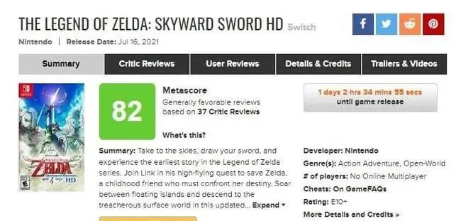《塞爾達傳說天空之劍HD》媒體評分當中,各大網站也紛紛給出了自己對於這款游戲的評分,目前本作在Metacritic上的均分為82,截止發稿前共有37家網站發布了評論,32家媒體給出好評,5家媒體給出中評,暫無差評。VGC為本作給出100分:雖然像這樣優秀的重製版也不能讓《天空之劍》成為一款完美的《塞爾達》游戲,但這確實是該系列中存在感最低的作品之一的大幅改進版,NS玩家可不能錯過。Nintendo Life為本作給出90分:《塞爾達傳說:天空之劍HD》引入了大量的技術改進和游戲質量更新,讓這個有十年歷史的游戲重新煥發了活力。動作控制比原版精準的多,作為代替方案的按鍵控制效果不錯,高清HD畫面,流暢的60fps游戲,以及一個被簡化得更有用的夥伴,這些改動真的讓我感受到《天空之劍》原本應有的體驗。確實,鎖定官方amiibo背後的即時旅行是一個錯誤,但除開這個問題,你能收獲一場絕妙的游戲體驗。這絕對是NS用戶和塞爾達粉絲必玩的游戲。IGN義大利為本作給出80分:《塞爾達傳說:天空之劍HD》是該系列中,因其世界設計和控制方案而令人印象深刻的,最奇特的一部的合格移植作品。CGMagazine為本作給出75分:雖然它可能是《塞爾達》系列中相對較差的作品之一,但《塞爾達傳說:天空之劍HD》本身的游戲體驗其實還算不錯。而fami通之前也是公布了游戲的評分,評分並不是太高,只有34分未能入白金 ,而編輯給的分數不高的原因,主要是有的測試人員表示Joycon手柄下的操作較為困難,經常累得大汗淋漓,氣喘吁吁。GamsSpot也是給出了不是特別高的分數7分,他們認為本作對原版的改良加強了游戲節奏,讓游戲更具可玩性,配樂和故事十分打動人等等,但同時按鍵操作體驗不佳,游戲中的眼淚狩獵(Tears hunts)以及其他內容拖慢了冒險節奏。