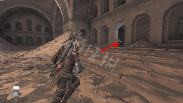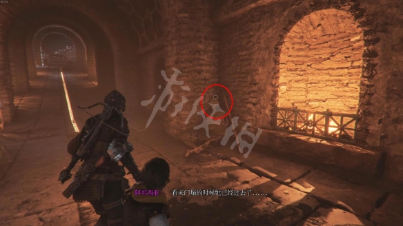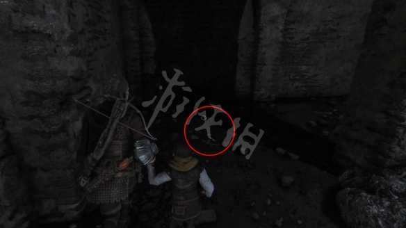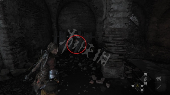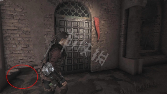 接下來想辦法打開大門。第一步先去左側下圖標記的位置,裡面有個開關。