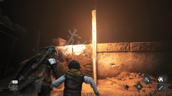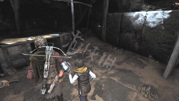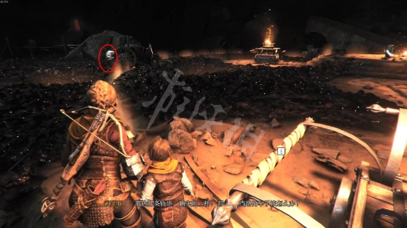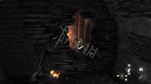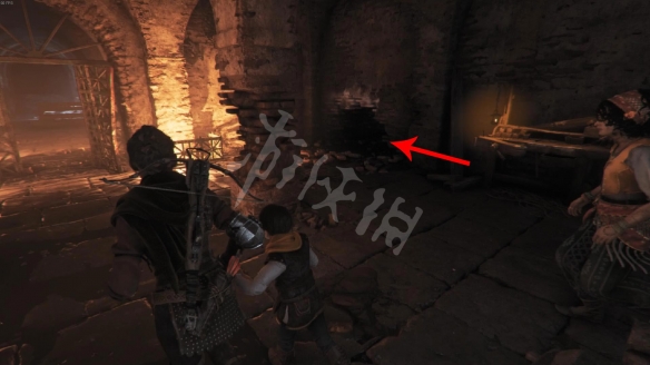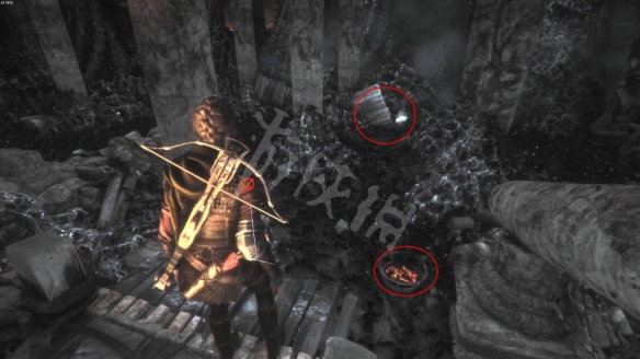 出來後,將下方的火盆點燃。跳下去向遠處的木板射一支火箭,火勢不夠可以再向木板扔塊焦油。
