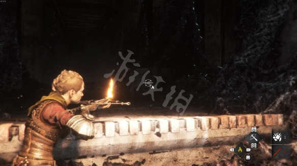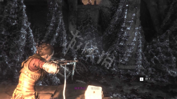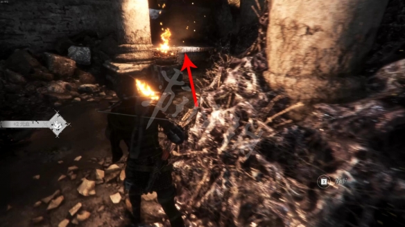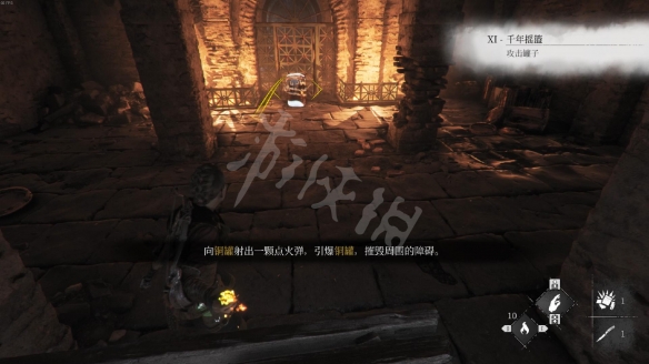 將火盆點燃後,使用繩錨向下方的炸葯桶射擊。將炸葯桶拽出來後引爆,下方擋路的障礙物會被清除。