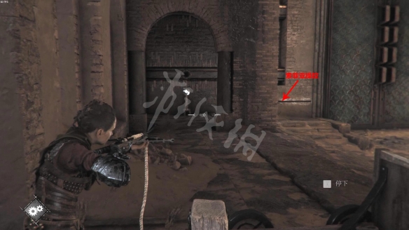 接著用推車上的繩錨射擊裡面的小拉桿,拉動後固定在推車上。這樣左側的門閂就被打開,可以命令索菲亞鬆手。
