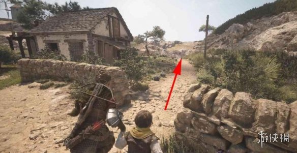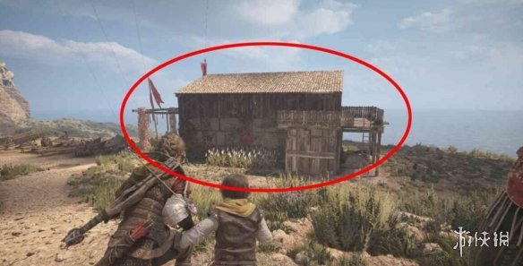 跟著大鳥雕像走,朝著遠處的雙子山前進,過橋後前往左手邊的塔樓(如下圖),先從窗口處打斷鐵門的鎖,然後進入塔樓,推開鐵門在門後的木桶上拿到短刀(如果手裡還有短刀,那麼可以先去開箱子,完事後再回來拿)。