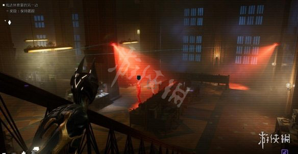 然後玩家前往哥譚警局,中間穿過證物室後來到辦公大廳,需要小心場地中的攝像頭,不要進入紅光區域,否則會立刻被敵人察覺。