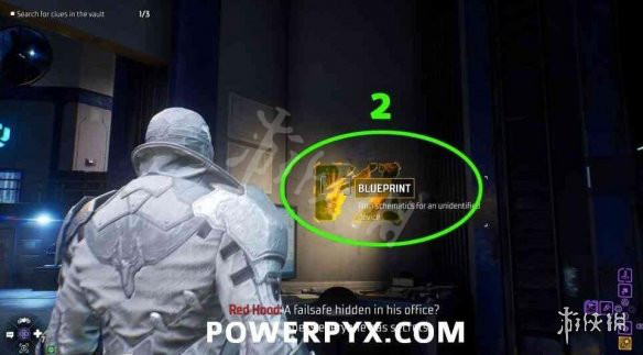 來到金庫後玩家需要先開啟金庫才能進入收集線索。擊敗房間內的敵人後,樓上有個控制台開關就在金庫門的正前方,按十字鍵的下鍵掃描並高亮,與之互動解開開啟金庫。