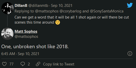 在最近的 PlayStation Showcase 上公布了《戰神:諸神黃昏》的游戲宣傳片之後,粉絲們提問續集是否會使用一鏡到底的相機。敘事總監 Matt Sophos 通過他的個人推特回應了這樣的詢問,他告訴一位好奇的 Twitter 用戶,《諸神黃昏》的相機確實會「像 2018 年《戰神》那樣是一個完整的鏡頭」。