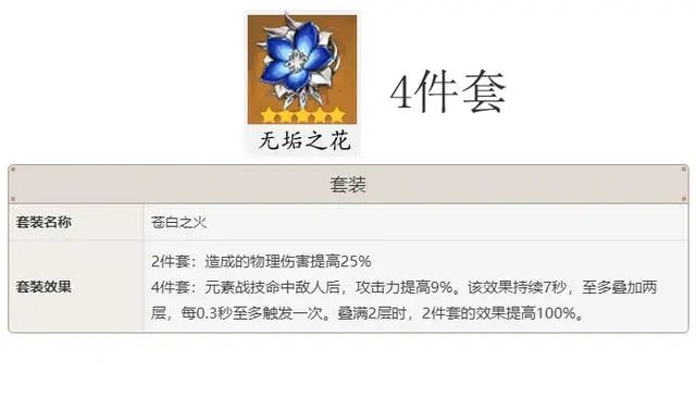 由於鍾離E技能放柱子是持續協輸出,所以可以觸發蒼白之火四件套效果,吃滿效果是(物理傷害50%+攻擊力18%),加上杯子的物理傷害58.3,就是物理傷害提升108.3%,非常適合鍾離打物理。
