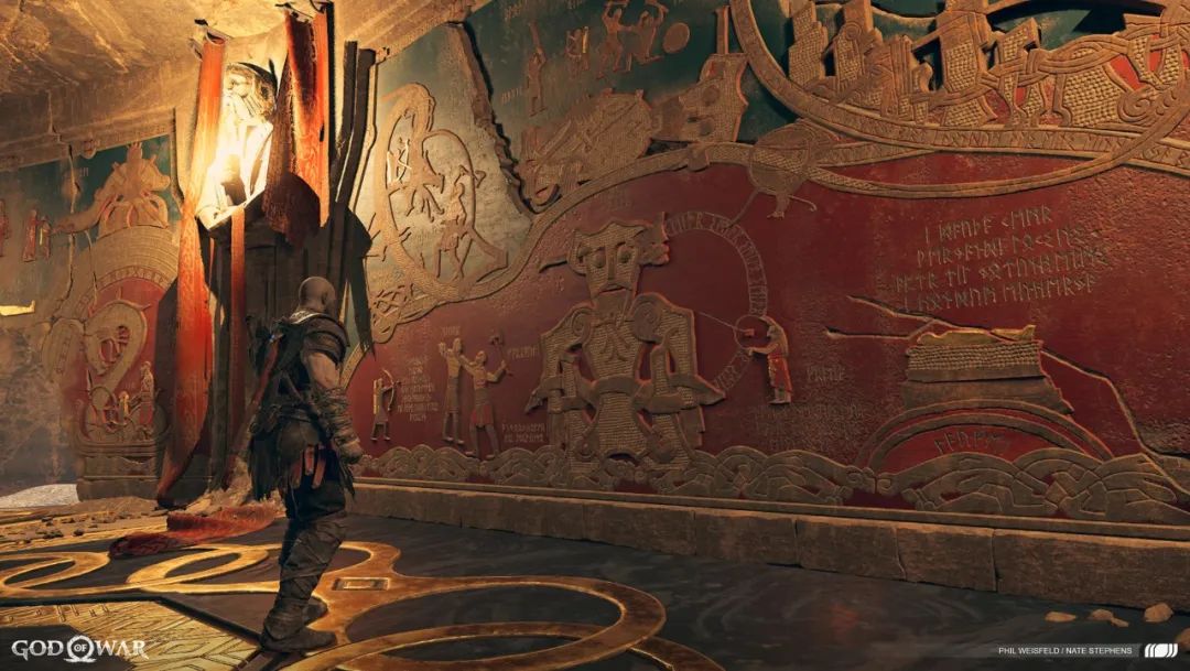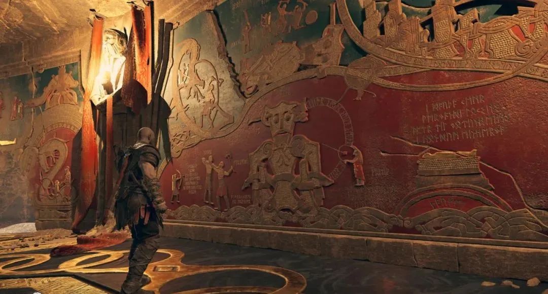 《戰神 4》的另一絕妙之處在於將來自希臘神話的人物奎托斯與北歐神話巧妙地聯系起來,在結局登上最高的山峰、將妻子的骨灰灑下之前,奎托斯與阿特柔斯在山洞中見證了巨人族的壁畫,將他們冒險的經歷事無巨細地刻畫出來。