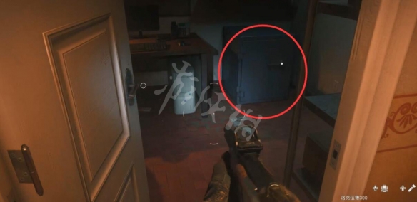 在樓上搜刮各個房間,開門見到撞門的人後,來到咖啡廳,到咖啡廳先不要直接跳下去,左拐撬門有個保險箱。