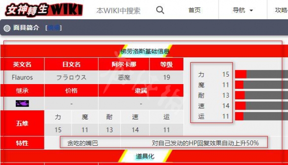 要求集體斷頭合成,特性為貪吃的嘴巴,效果是對自己發動的HP回復效果自動上升50%。五維特性分別是:力15、魔11、耐13、速14、運11。