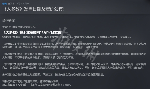 大多數是一款國產角色扮演類生活模擬遊戲,很多小夥伴可能還不清楚遊戲的完整版什麼時候上線吧,今天小編給大家帶來大多數遊戲完整版上線時間介紹,快來看一下吧。