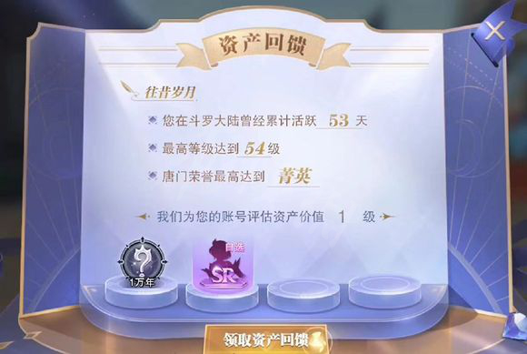 3.它會對你的賬號進行資產評估,評估條件包括你的斗羅游戲的活躍天數,最高等級,唐門榮譽也就是最高充值等級,活躍天數越長、最高等級越高、充值等級越高,評估分就越高,回饋獎勵就越好。