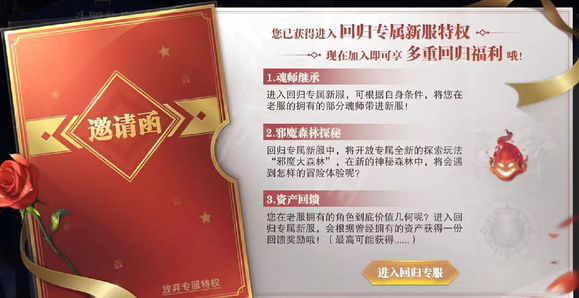 可以進入回歸服時,會收到邀請函。最後在登錄時選擇回歸服,選擇你想要進入的伺服器登錄就可以。