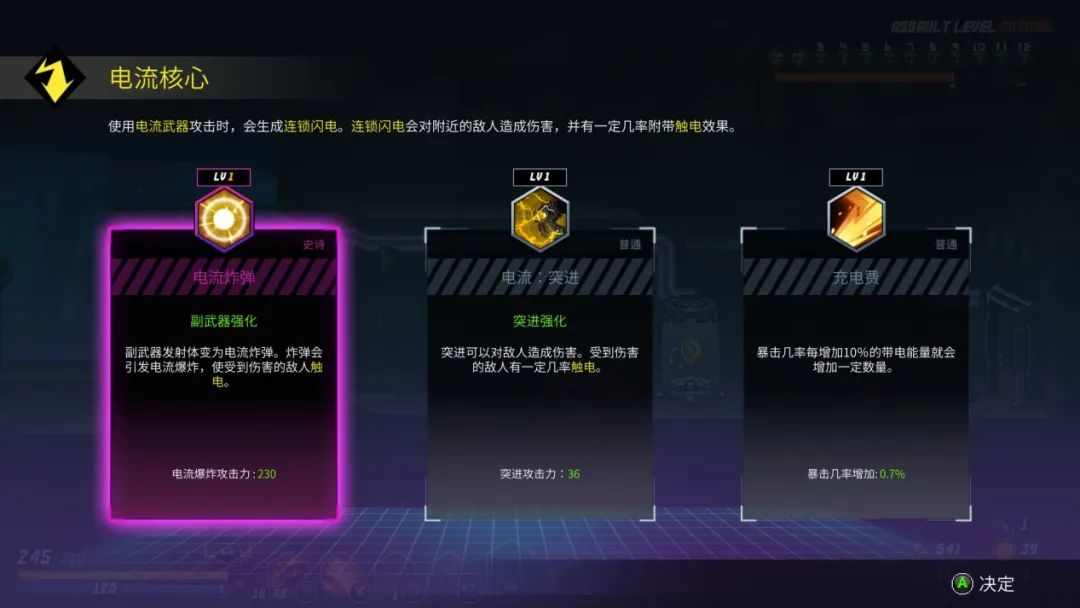 2、主武器槍選擇火焰核心,副晶元選擇電流並拿到電流炸彈,前期依靠槍的遠程高頻率輸出和電流炸彈控場快速打出爆炸傷害,無論是清場和boss戰都有著極高的效率;缺點是後期關卡存在大量精英,電流炸彈控場能力有限導致容易受擊。
