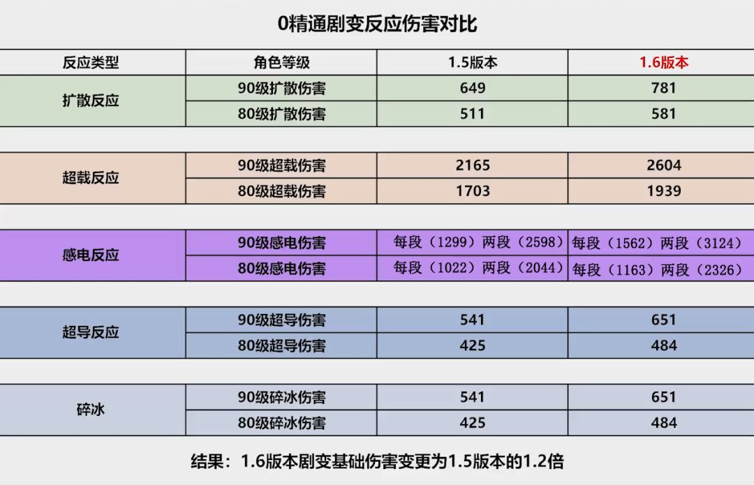 以上資料圖表所示,改版劇變增強了1.2倍傷害,超導和碎冰係數太低,意義不大;超載反應雖然係數高,不過會炸飛怪物,也不好打;擴散反應係數傷害雖然一般,但擴散反應是群體傷害,打群怪收益高;而感電反應是劇變中係數是最高,雷系也只有打感電最適合,因此這次增強受益最大的是風系角色和雷系角色。