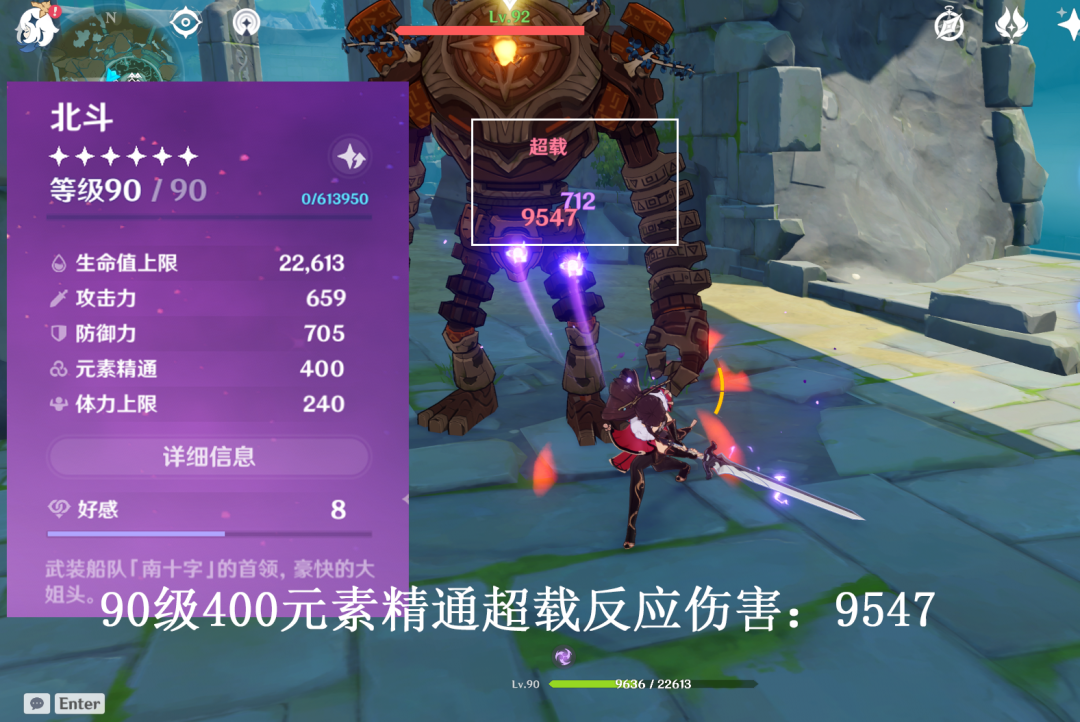 如圖:不帶套裝90級北斗0元素精通觸發超載反應傷害:2604, 如果帶如雷4件套還能提高40%,那傷害就是:3645,傷害非常可觀。
